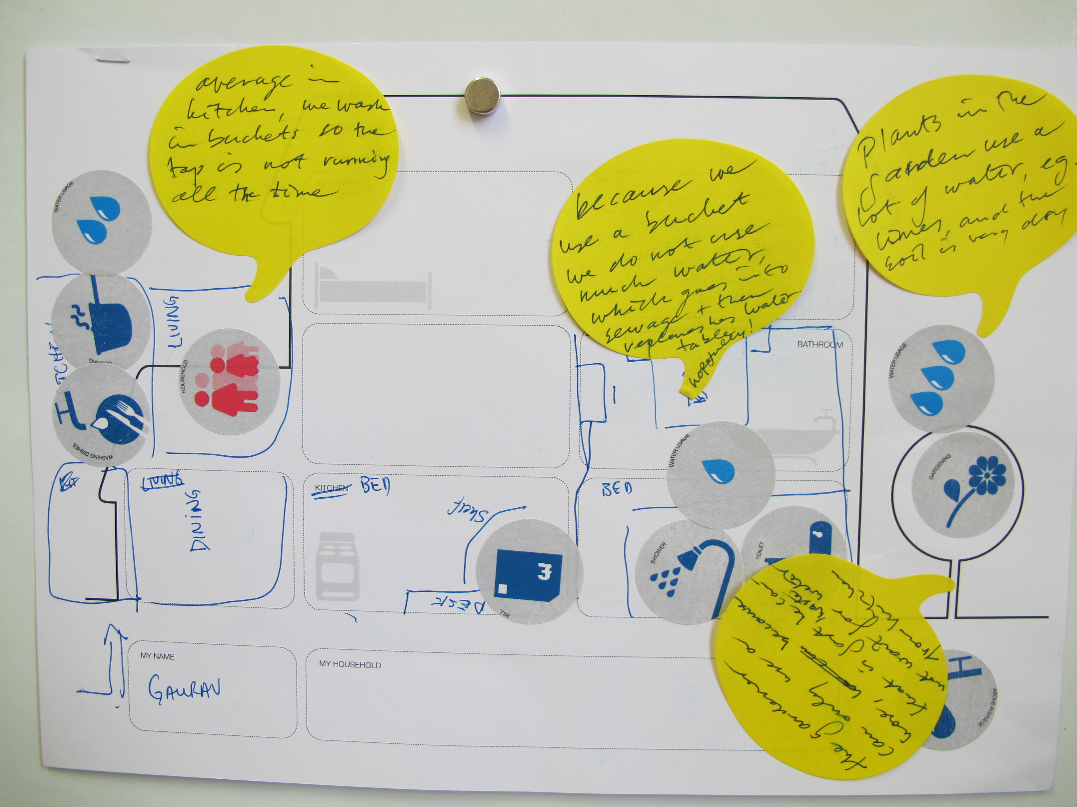 As part of the conference programme, Geke and Bas ran a workshop that provided a general introduction to design research principles. As part of this, they later looked in detail at the project on water usage and sustainability we designed for Southern Water. During the workshop they used some of the materials we’d designed for this project with the UnBox audience; this gave them the opportunity to gain hands-on experience with some design research tools, whilst also providing us with a snapshot of domestic water-use (and people’s perception of this) in India.