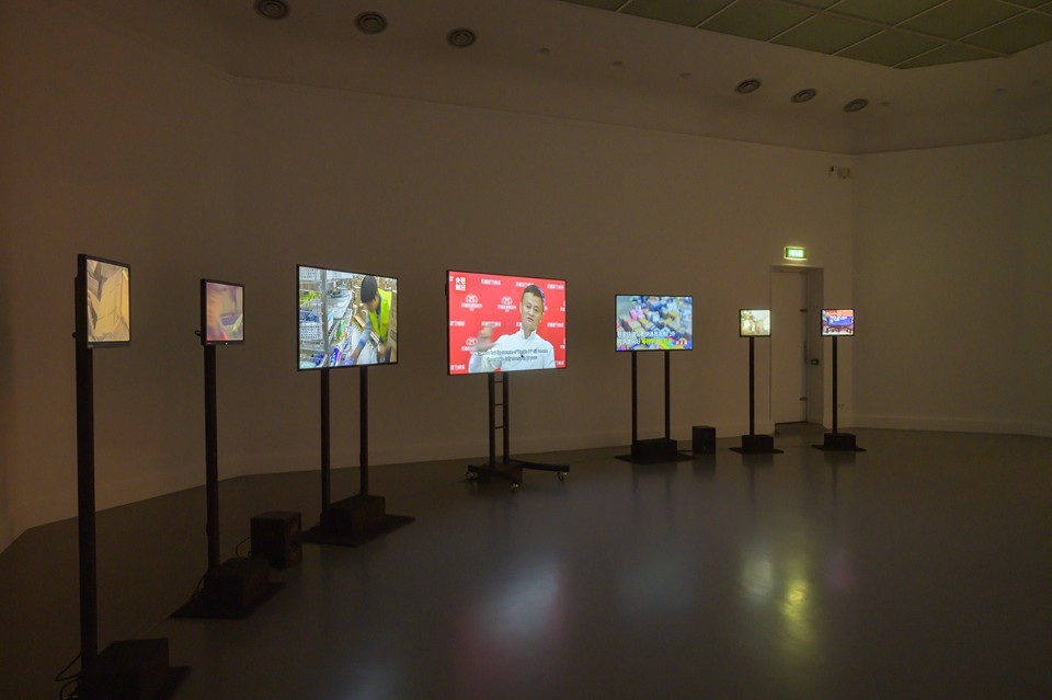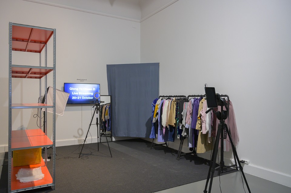 One room presents the work of Jing He – LIVE STREAMING.Jing He invited two Chinese live streaming hosts to set up a temporary studio inside the museum, live-streaming their usual sale of products through platforms associated with Alibaba; Erbi Chen (陈膧僈), is a KOL (KeyOption Leader) and Qiong Ye Chuan Zi (琼页藿磾), works for a fashion company. During their performance, they both demonstrated, tried, tased, smelled dozens of products, influencing shoppers around the globe to buy.