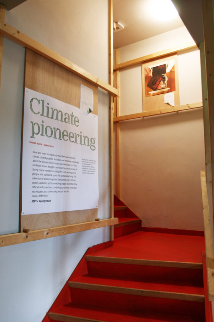 The exhibition ‘Climate Pioneering’ shows thoughts and experiences on climate action by Spring House members in daily life. Each poster in the exhibition gives a glimpse into a personal quest for sustainable living. From waking up to winding down at night, and the time in between, there are lots of occasions we all make climate conscious or unconscious decisions. The staircase exhibition shows various examples: from a plastic free diet to a plastic collection after cooking supper, clothes sharing through a fashion library, waste separation at home, and city gardening.