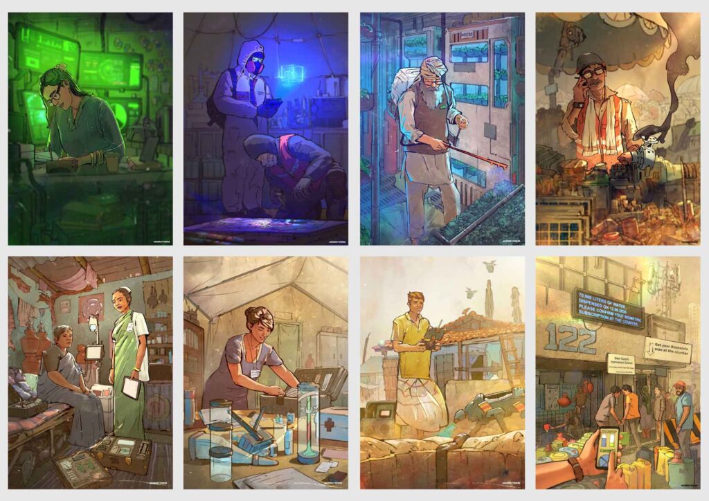 Design Fiction was used to explore what the future of humanitarian work in India could look like in 2035, and how aid communities would come together to tackle these challenges. The story of HUM2035 is narrated through the lives and work of the future humanitarian workers as they navigate the crisis in local contexts with new services and technologies. These future humanitarian roles include the upskilled well-digger aiming to provide clean water amidst threats of water-borne disease, and the frontline health worker providing in-person and online emergency care.