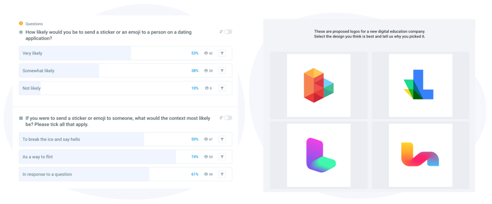 Analysis on Usability hub is a simple, no frills affair (Left). Questions are highly visual (right). Source