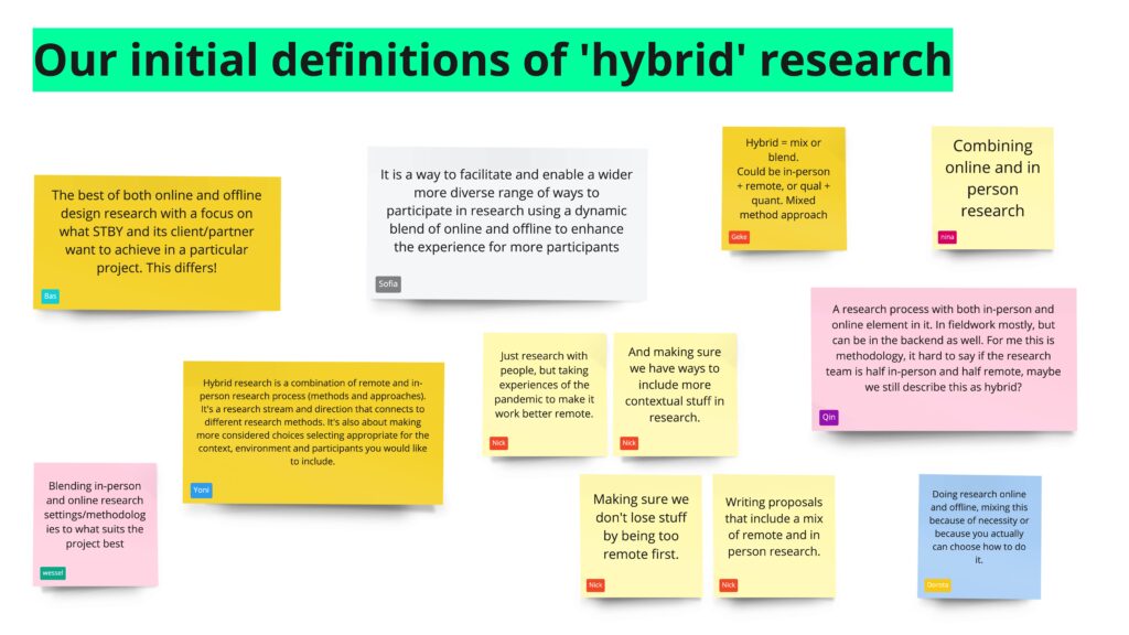 With studios in both the United Kingdom and the Netherlands, a number of international clients and being part of the global Reach Network, STBY has been working in a hybrid way for many years. During the pandemic we had to intensify our remote working skills, which provided both new opportunities and challenges for doing hybrid research. Today hybrid research is even more deeply embedded as a way of working and, because of this, we want to make some of these practices explicit to colleagues and share them with other designers and researchers.