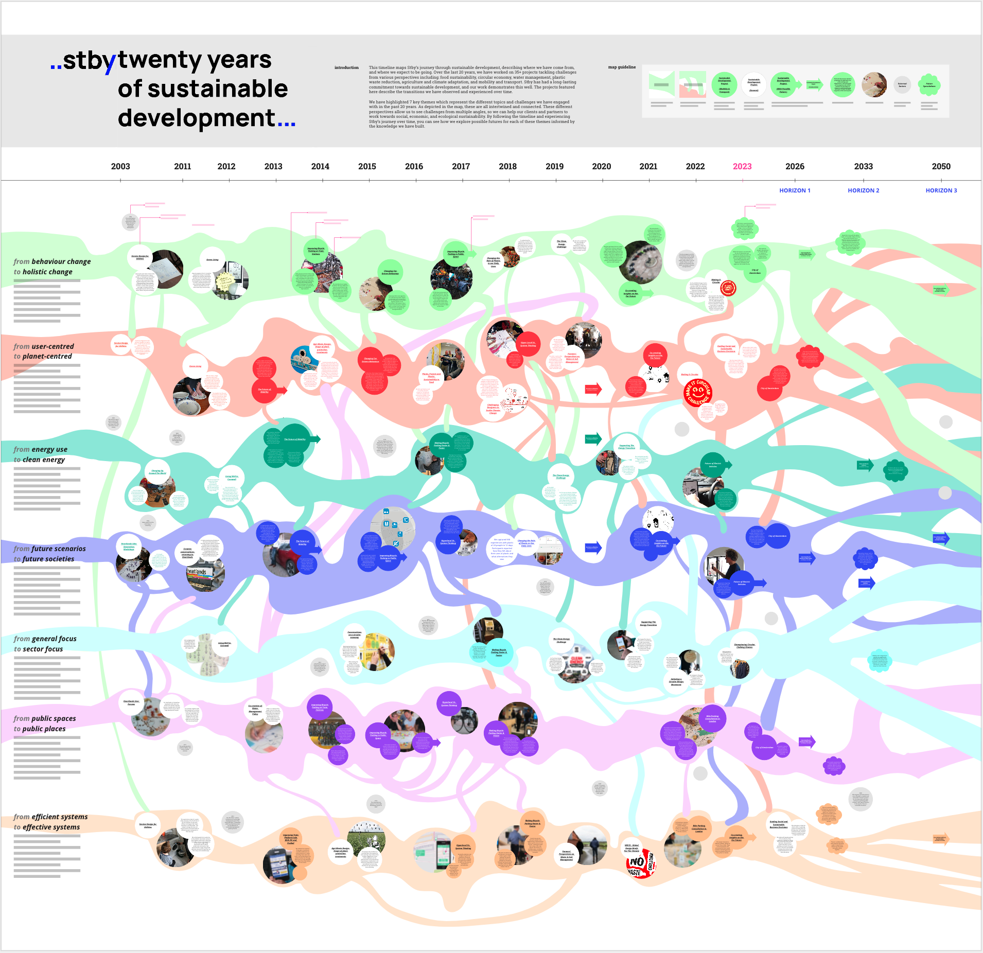 We have highlighted 7 key themes on the map, which represent the different topics and challenges we have engaged with in the past 20 years. As visually depicted, these themes are all intertwined and connected. These different perspectives allow us to see challenges from a different angle, so we can help our clients and partners to work towards social, economic, and ecological sustainability. By following the timeline and experiencing Stby’s journey over time, you can see how we explore possible futures for each of these themes informed by the knowledge we have built.