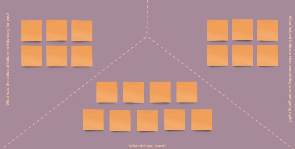 The foundation of many of these conversations was based on work moments each team member had experienced that perhaps could have gone better. These reflections asked for a level of vulnerability from our team members that could be scary and even a bit uncomfortable. To lower the barrier of doing so, two of our team members who facilitated these sessions shared their own ‘failure stories’ using empathy maps we had designed to break down what happened and create space for reflection.