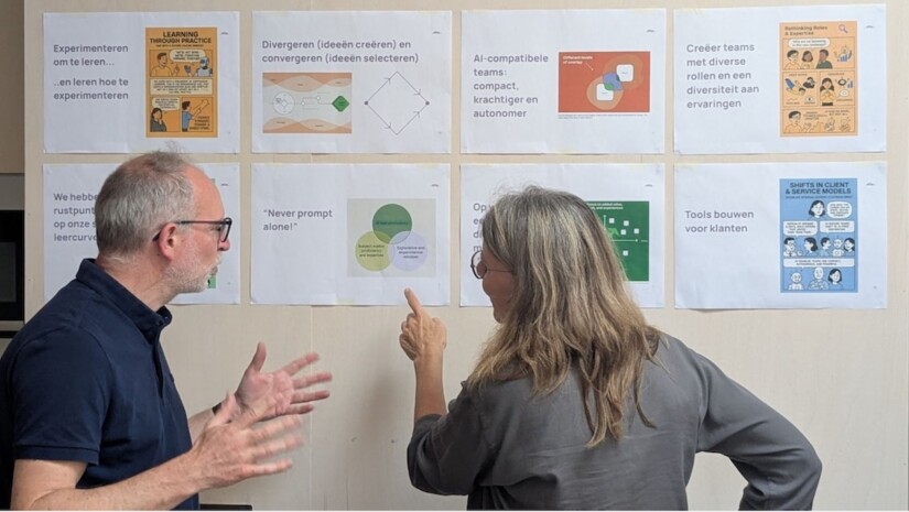 We designed and facilitated a series of hands-on workshops with ‘frontrunners’ and ‘explorers’ in the client organisation. These are the people who naturally gravitate towards new and evolving methods and practices, and who usually play a pivotal role as changemakers nudging the rest of the teams to start thinking and doing things differently. The umbrella motto for these workshops was ‘Experimenting to learn, Learning to experiment’. The programme consisted of carefully designed AI-first experiments in small groups, which were followed up by reflections on how these experiments went and what they might mean for their future ways of working, both internally and with clients.