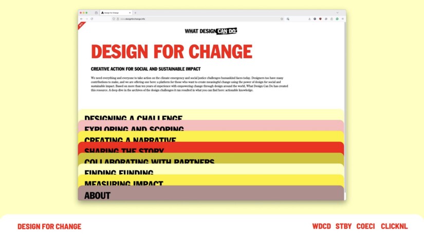 Together with What Design Can Do (WDCD) and the Centre of Expertise for Creative Innovation (CoECI), Stby has developed Design for Change, a practical resource built on ten years of WDCD’s design challenges. The platform makes this collective knowledge accessible, actionable and transferable for creatives, organisations, changemakers and educators working across design, climate and social justice.